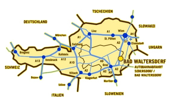 Zur Heiltherme Bad Waltersdorf gelangt man sowohl aus Richtung Wien als auch aus Richtung Graz über die Südautobahn (A2). An der Ausfahrt Bad Waltersdorf (127) fahren Sie in Richtung Sebersdorf und biegen nach rechts auf die Hauptstraße (L401) ab. Nach etwa 2,4 Kilometern nehmen Sie im Kreisverkehr die dritte Ausfahrt (Thermenstraße). Dort befinden sich nach weiteren 1,2 Kilometern die Therme und das angeschlossene Quellenhotel.